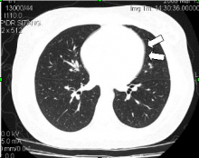 Fig 2: Computed tomography reveals minimal amount of pneumopericardium (arrows).