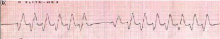 Ventricular tachycardia (VT)VF ในส่วนของ VTต้องแยกจาก broad QRS complex sine wave pattern ให้ดี แต่ VT/VF มักเกิดตามหลัง sine wave pattern อย่างรวดเร็ว และมักเกิดเมื่อ serum K ≥ 8.0 mmol/L อย่างไรก็ตามมีรายงานว่าจะเกิดช่วงใดก็ได้ระหว่าง peaked T wave และ sine wave pattern14 VT เกิดขึ้นได้จากภาวะ hyperkalemia แม้ว่าจะไม่บ่อยเท่า hypokalemia ถ้าสงสัยควรต้องรีบรักษาทันที นอกเหนือจากกระบวนการกู้ชีพขั้นสูงเช่นเดียวกับ PEA/Asystole