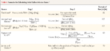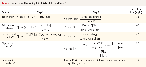 ยกตัวอย่าง ผู้ป่วย 70 กิโลกรัม มี [Na+] 105 mmol/L ต้องการให้ขึ้นมา 2 mmol/L (107 mmol/L) ในเวลา 2 ชั่วโมง ดังนั้น [Na+] ที่ต้องให้จะเท่ากับ (107-105)X(0.6)(70) = 84 mmol เท่ากับ 3% NaCl (513 mmol/1000ml) จำนวน 84/513 ~ 0.16 litre (160 ml) จะให้ผู้ป่วยรายนี้ใน 2 ชั่วโมง จะต้องให้ 3% NaCl rate 160/2 = 80 ml/hour