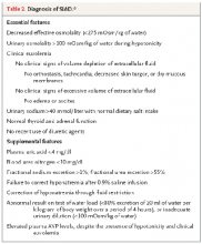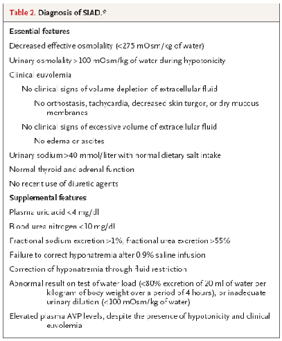 สังเกตว่า Urine osmolarity > 100 mOsm/kg of water และต้องไม่อยู่ในภาวะ hypovolemia อย่างไรก็ตามการดูอาการทางคลินิกเพียงอย่างเดียวว่าผู้ป่วยมีภาวะ dehydration อาจกระทำได้ยาก เนื่องจากมี sensitivity ต่ำ การดูผลอย่างอื่นประกอบเช่น Hypouricemia < 4 mg/dL6,7, low BUN, หรือ urinary sodium > 40 mmol/liter8 จะช่วยยืนยันภาวะ SIAD ได้