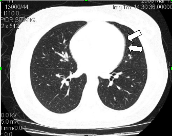 A 24-year-old, previously healthy woman presented to the emergency department in March 2008 due to Left-sided chest pain radiated to the neck for a week. She denied history of cough, lifting heavy objects  or flight at the onset of symptoms.