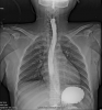 Without special supportive treatment such as sedation, analgesic or antibiotics and no interventions such as pericardiocentesis were necessary. Repeated chest films in 2 days later, show progressive resolved  of the air in the pericardial sac and the patient was discharged. There was no recurrence of pneumopericardium during follow up.